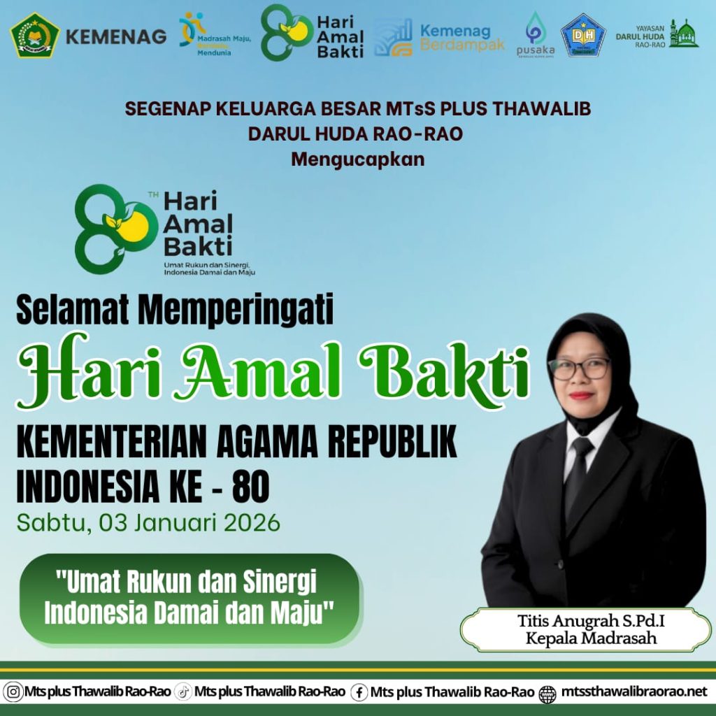 SEGENAP KELUARGA BESAR MTsS PLUS THAWALIB DARUL HUDA RAO-RAO mengucapkan Selamat Memperingati: HARI AMAL BAKTI (HAB) ke-80 KEMENTERIAN AGAMA RI (03 Januari 2025) “Umat Rukun dan Sinergi, Indonesia Damai dan Maju”