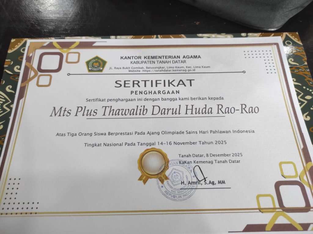 MTs Plus Thawalib Darul Huda Rao-Rao mendapatkan penghargaan dari Kantor Kementerian Agama Kabupaten Tanah Datar atas apresiasi prestasi kepada 3 orang siswa dalam ajang Olimpiade Sains Hari Pahlawan Indonesia Tingkat Nasional yang dilaksanakan Tanggal 14-16 November Tahun 2025. Penghargaan ini diserahkan secara langsung oleh Bapak H. Amril S.Ag.,MM selaku Kepala Kantor Kementerian Agama Kabupaten Tanah Datar kepada kepala Madrasah ibu Titis Anugrah S.Pd.i di Aula Ikhlas Beramal Kantor Kemenag Kabupaten Tanah Datar.