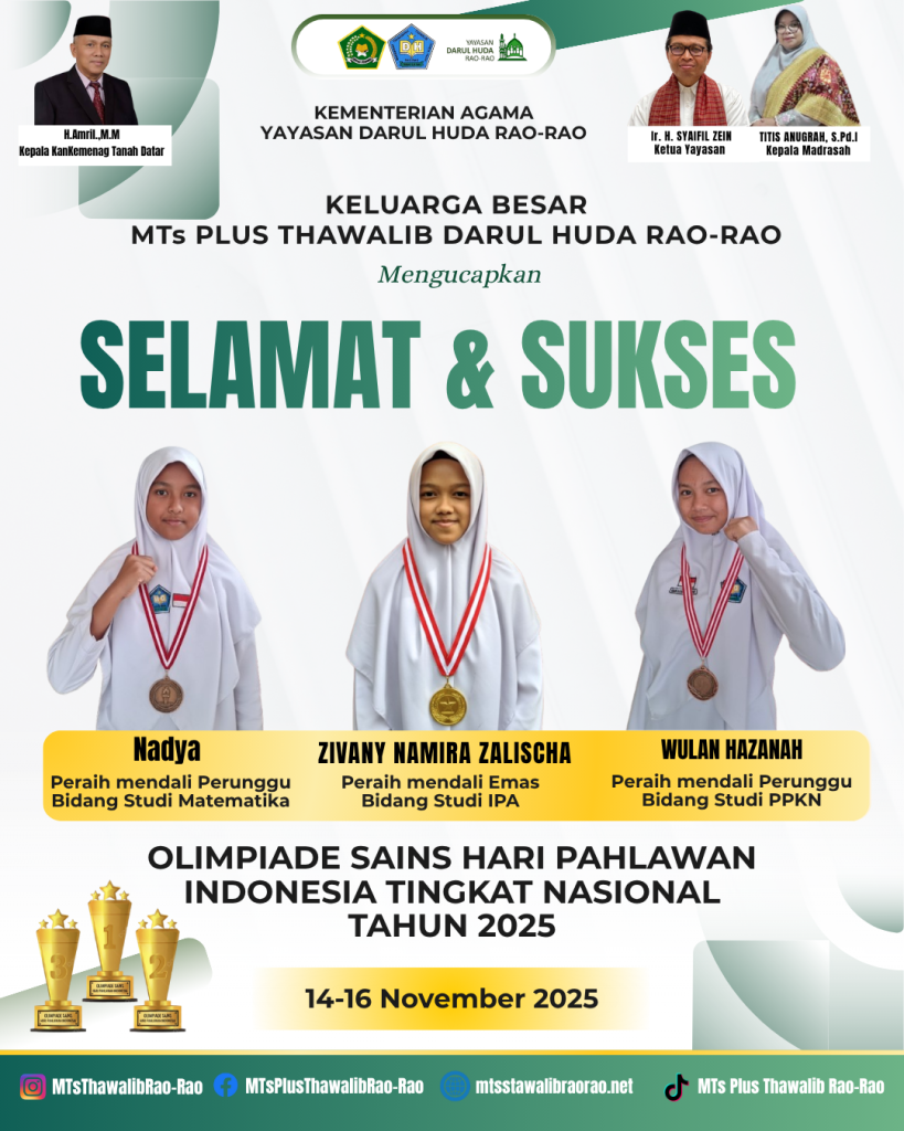 Alhamdulillah tiga peserta didik MTsS Thawalib Rao – Rao menoreh prestasi membanggakan dalam rangka Hari Pahlawan Nasional.