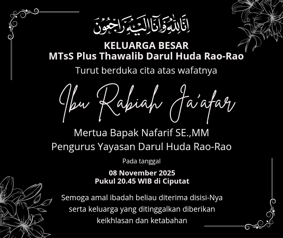 Keluarga Besar MTsS Plus Thawalib Darul Huda Rao – Rao turut berduka cita yang mendalam atas berpulangnya Ibu Rabiah Ja’afarMertua Bapak Nafarif SE.,MMPengurus Yayasan Darul Huda Rao-RaoPada hari Sabtu/ 08 November 2025 pukul 20.45 WIB di CiputatSemoga beliau diberikan tempat terbaik dan semua amal baiknya dibalasi Allah Subhanahu Wa… [[ BACA SELENGKAPNYA...]]