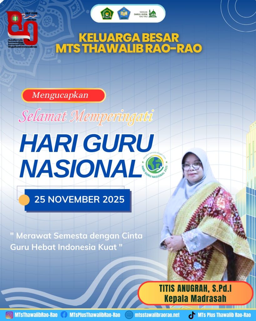 Keluarga Besar MTs Thawalib Rao-Rao mengucapkan Selamat memperingati Hari Guru Nasional ke-80 Selasa, 25 November 2025. Dengan Tema Merawat Semesta dengan Cinta Guru Hebat Indonesia Kuat